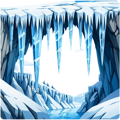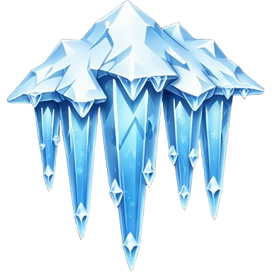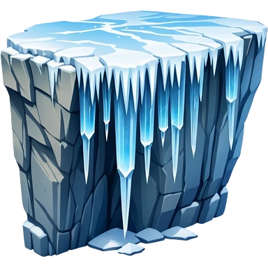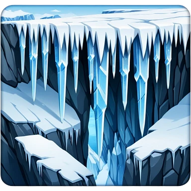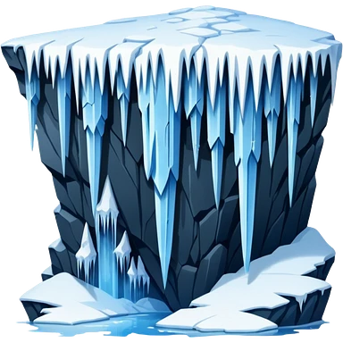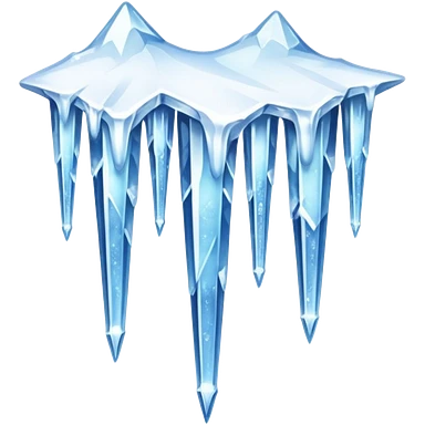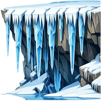 A stunning winter scene showing long, sharp icicles hanging from a frozen cliff or ledge, glistening in bright daylight. The surface is covered in snow and ice, with a cold blue and white color palette, highly detailed, realistic lighting, and frosty atmosphere.emoji