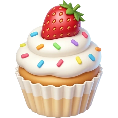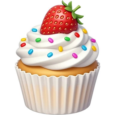 A cute and delicious cupcake topped with fluffy white whipped cream, colorful rainbow sprinkles, and a fresh strawberry on top, highly detailed, soft lighting, pastel tones, clean minimal background, realistic texture, high resolution emoji