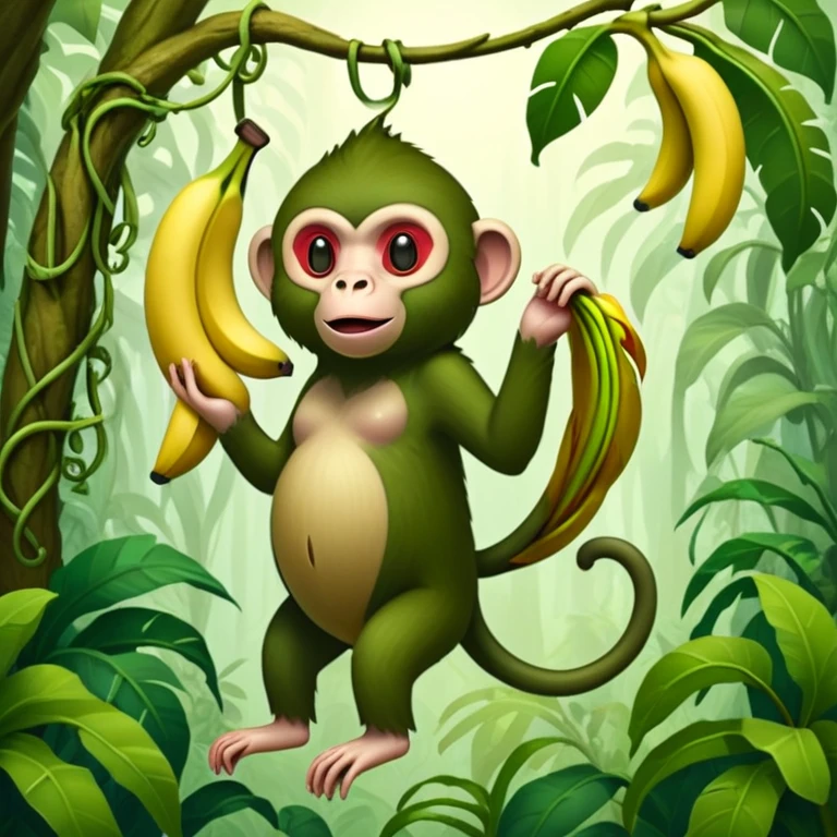 A surreal hybrid creature that is half monkey (top) and half banana (bottom). Green monkey with red facial features on top, and an opened banana peel forming the lower body. Set in a jungle with hanging vines and soft light filtering through treesemoji