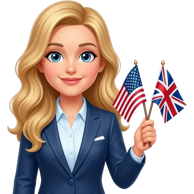 a teacher with long wavy blond hair with the british and the usa flag in the right hand emoji