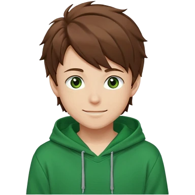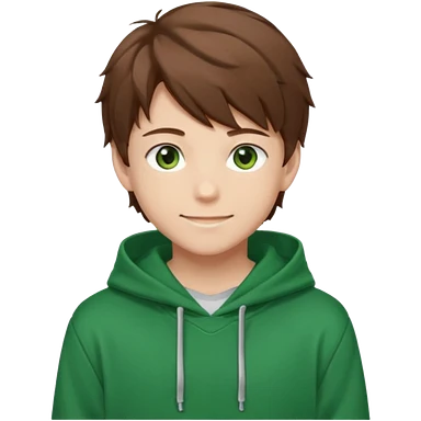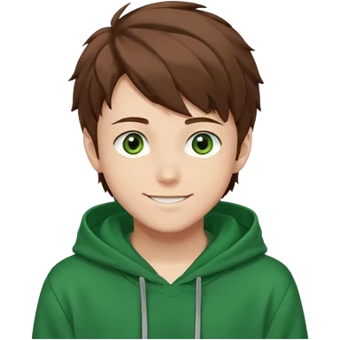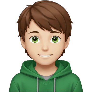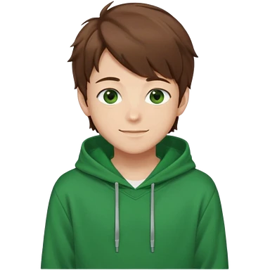 Anime teen boy with brown hair, green eyes, and a green hoodie, looking smiling slightly sideways positioned. Face must be main filling of the emoji. A little piece of hoodie can be visible. 128px emoji