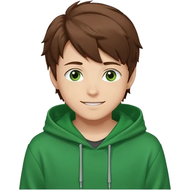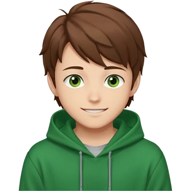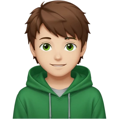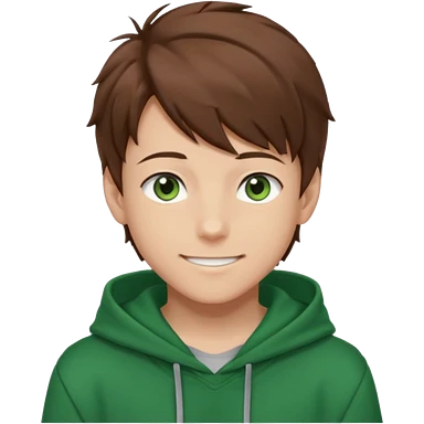 Anime teen boy with brown hair, green eyes, and a green hoodie, looking smiling slightly sideways positioned. 128px emoji