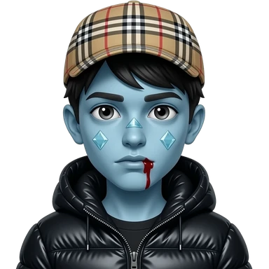 A teenage boy with light skin and diamond face, black short straight messy hair, straight natural eyebrows, dark hunter eyes, medium-big straight nose, soft jawline. Natural lips and smooth skin. Looking directly at the camera. Wearing a shiny black Moncler puffer jacket. emoji | AI Emoji Generator