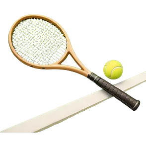 A tennis racket with a bright yellow tennis ball resting on it, set against the backdrop of a well-maintained tennis court. The scene emphasizes the smooth lines of the court and the focus on the ball and racket, symbolizing the elegance and precision of the sportemoji