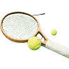 A tennis racket with a bright yellow tennis ball resting on it, set against the backdrop of a well-maintained tennis court. The scene emphasizes the smooth lines of the court and the focus on the ball and racket, symbolizing the elegance and precision of the sportemoji