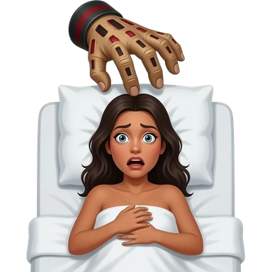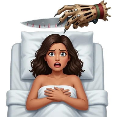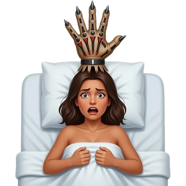 top view of a deeply tanned naked woman lying in bed clutching the bed sheets looking at the camera and is terrified by a dream of a giant freddy krueger's glove with knife blades fingertips reaching out directly above her head emoji