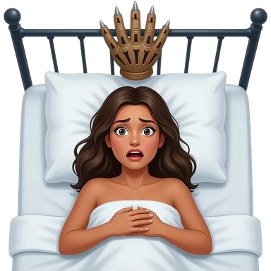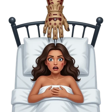 top view of a deeply tanned naked woman lying in bed clutching the bed sheets looking at the camera and is terrified by a dream of a giant freddy krueger's glove reaching out above her head emoji