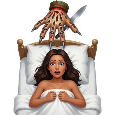 top view of a deeply tanned naked woman lying in bed clutching the bed sheets looking at the camera and is terrified by a dream of a giant freddy krueger's glove with knife blades fingertips reaching down directly above her head emoji