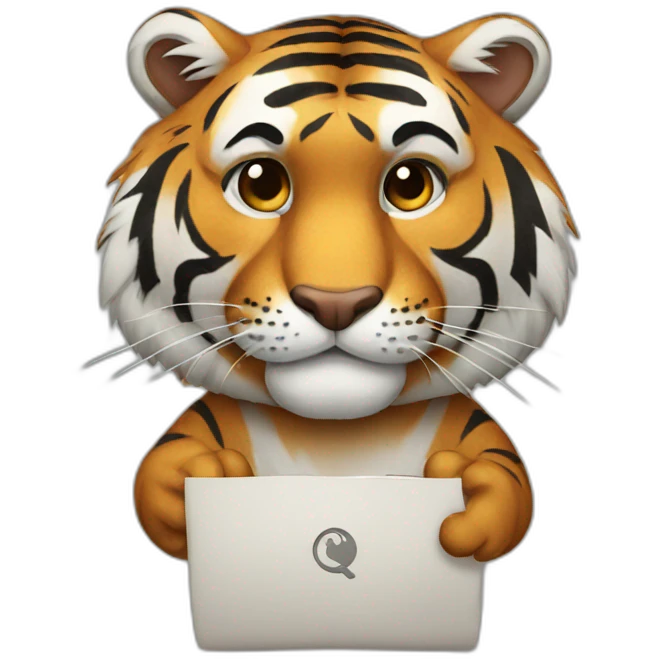 A tiger who study on a laptop with the word "AVEX" on the laptop emoji