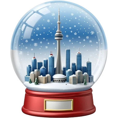 A Tiny beautiful hyperrealistic Glass Snow globe, with Toronto City CN tower within the global, full of snow, with canadian flag, expressing a snow storm in ontario. "TORONTO 2026" Craved into the metal label on front. Isolated, 3D render emoji | AI Emoji Generator