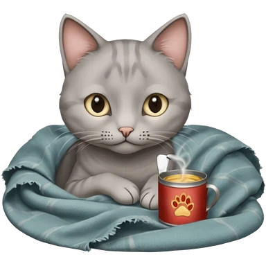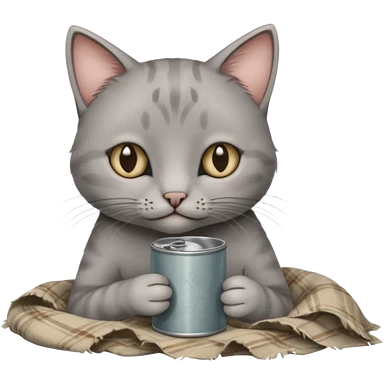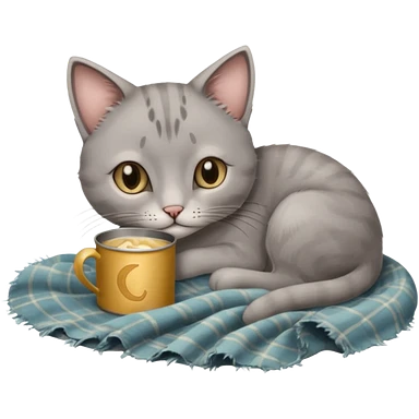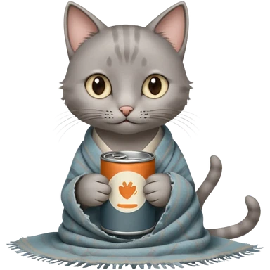 A thin grey cat curled on an old blanket, holding a tiny tin cup with its paws while looking shy but sweet. emoji