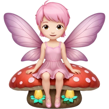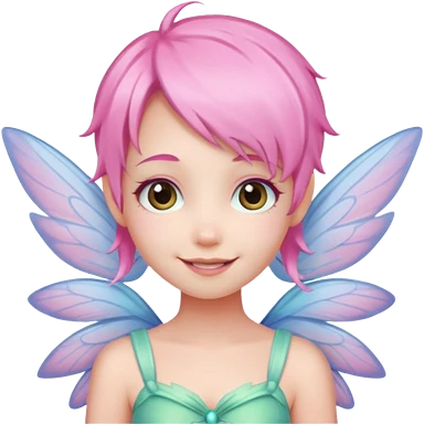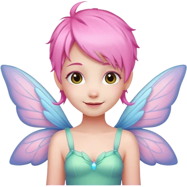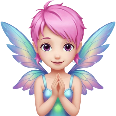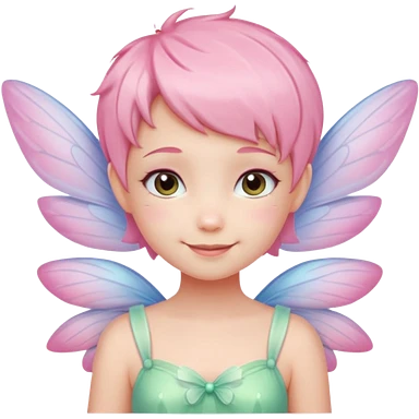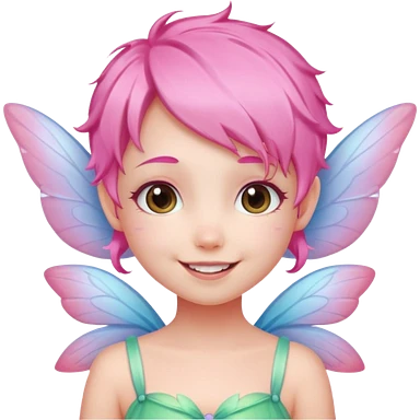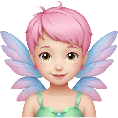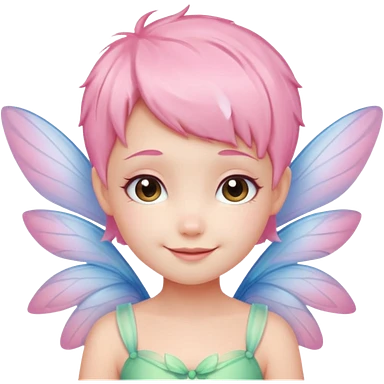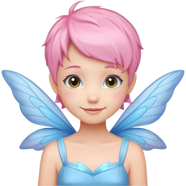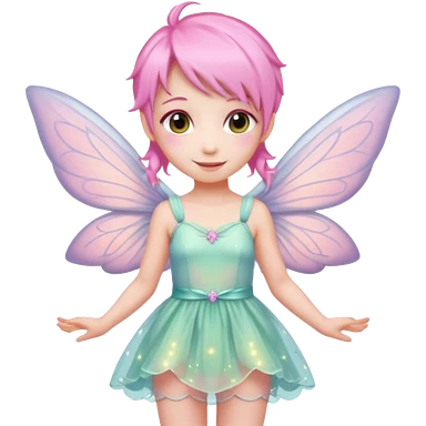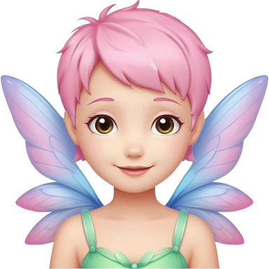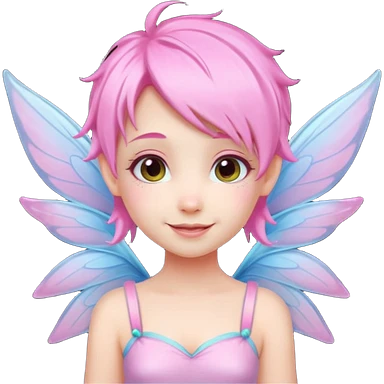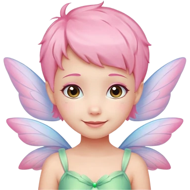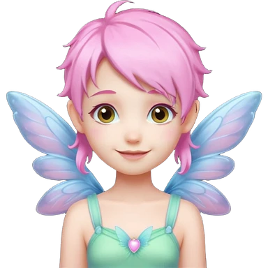 A tiny pastel fairy with pink short hair with glowing wings and a sweet smile emoji