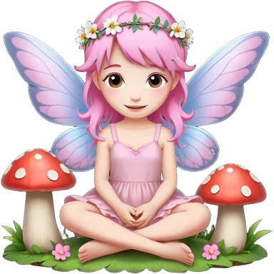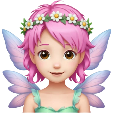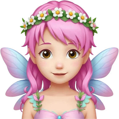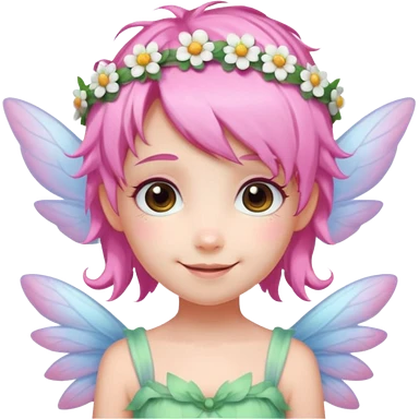 A tiny pastel fairy with pink hair with glowing wings and a sweet smile and tiny flower crown emoji