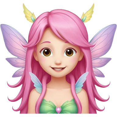 A tiny pastel fairy with pink long hair with glowing wings and a sweet smile emoji