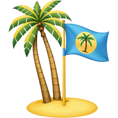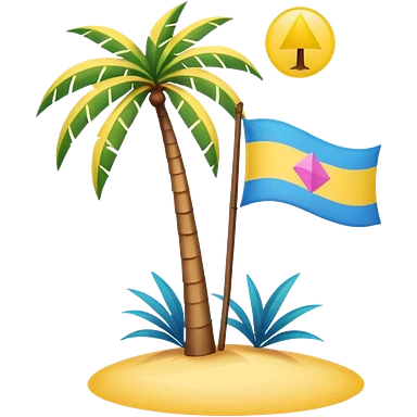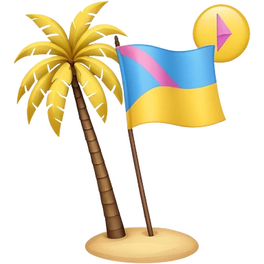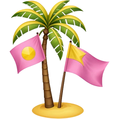 A pink flag in this flag there’s two small blue triangles on the sides In the middle of the circle on the flag a small pink palm tree coming out of the sides yellow circle with two thick yellow stripes emoji