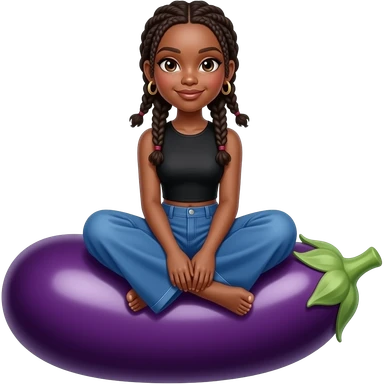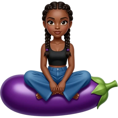 a black girl sitting on an eggplant with crossed legs wearing a baggy blue trousers with a slim fitted black top with knotless braids a hair style emoji