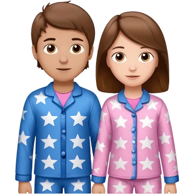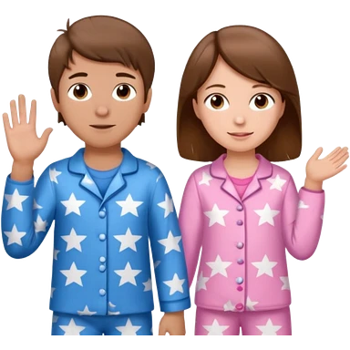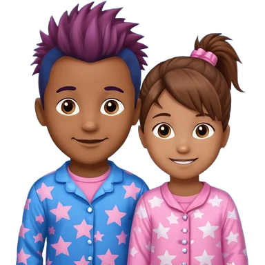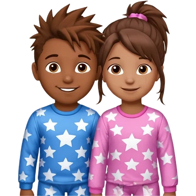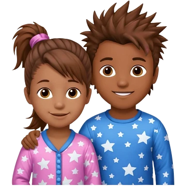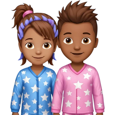 A toddler girl with brown hair with two pig tails, wearing pink pajamas and a bigger 4 year old boy with spikey brown hair, wearing blue pajamas. Both light skin and smiling. emoji | AI Emoji Generator