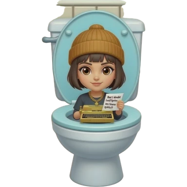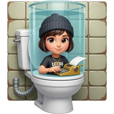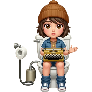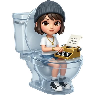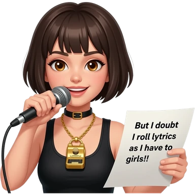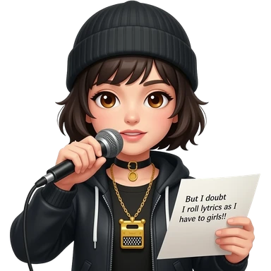 A tomgirl with short boyish hair, a beanie, and brown eyes rapping and wearing a golden stenography machine as a necklace. On her paper are the lyrics: "But I doubt I roll lyrics as I have to girls!!"