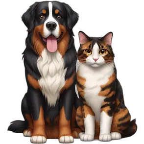 A Bernese dog beside A tortoiseshell cat without white emoji