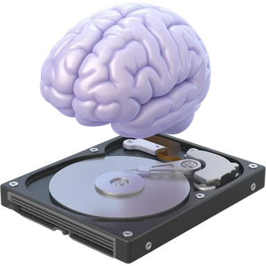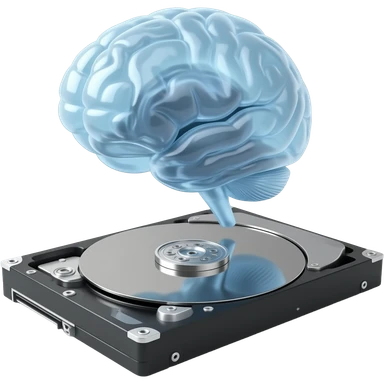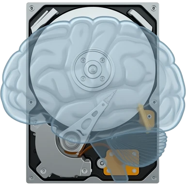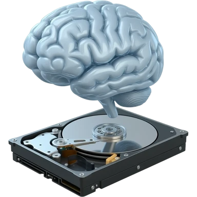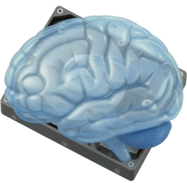 a transparent synthetic brain floats attached to many cables and tubes on a hard drive emoji