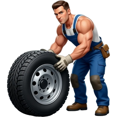 a truck tire laying flat on the floor and a man trying to lift it emoji | AI Emoji Generator