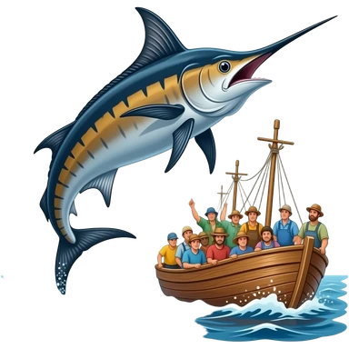a massive marlin jumping into a fishing boat load of fishermen emoji