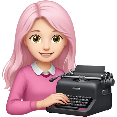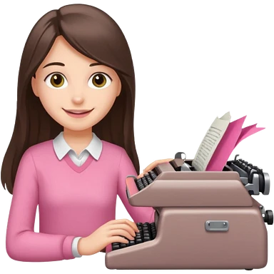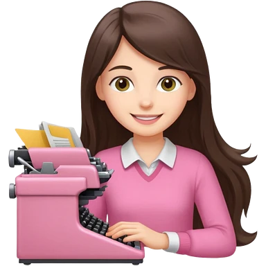 smiling white long brunette hair girl with hazel eyes wearing pink typing on a typewriter emoji