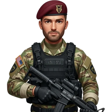 A US army soldier in combat gear, with a maroon beret like in the 82nd airborne. Make the tactical vest also in camouflage. Give him an asthetic that would belong to a 13F, forward observer emoji | AI Emoji Generator