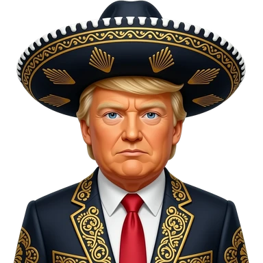 A very Orangish, media stereotypical Donald Trump in the Apple IOS simple style, wearing Stereotypical and ornate Mexican clothing And hat. Simplified face and very top bust. Colorful clothing, the literal EMBODIMENT of the phrase “Taco Trump” emoji | AI Emoji Generator