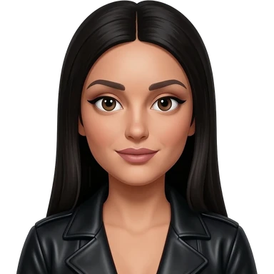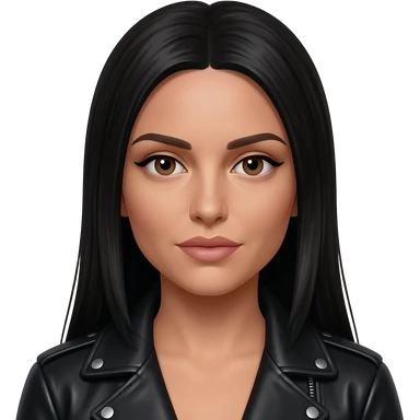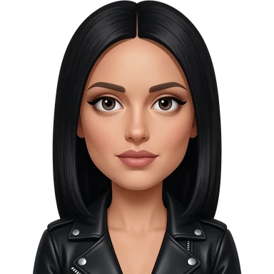 hyperrealistic foto of an italian very white woman with black long straight hair, cheekbones, long nose, almond eyes, large mouth, very thin lips, eyeliner and black leather jacket emoji