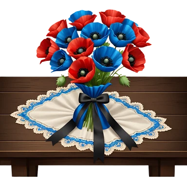 A very lush bouquet of bright blue and vivid red poppies black satin ribbon, resting on an antique wooden table, with an off white lace pattern table cloth emoji