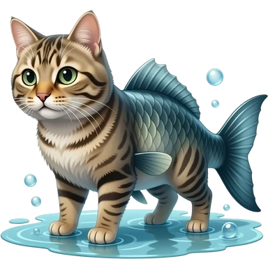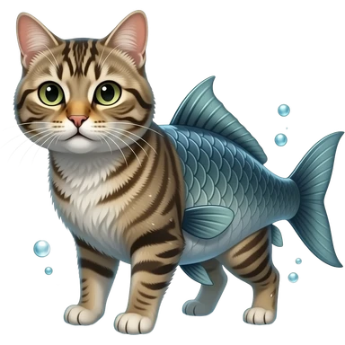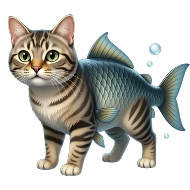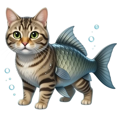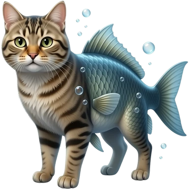 A realistic hybrid animal with a cat’s head and fur, combined with a fish body and fins, underwater environment, bubbles, natural lighting, detailed whiskers, wet texture, photorealistic emoji