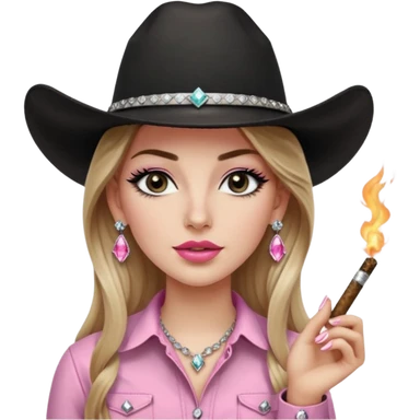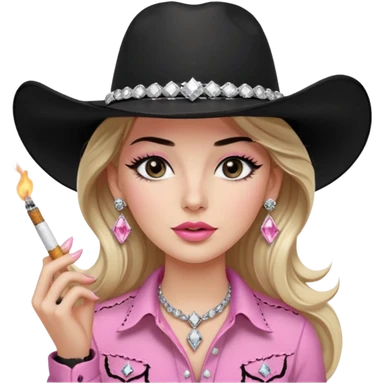 White girl, black cowboy hate with hat band sparkling, long brown straight hair, pink and black western shirt, smoking a joint, big diamond earrings emoji