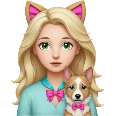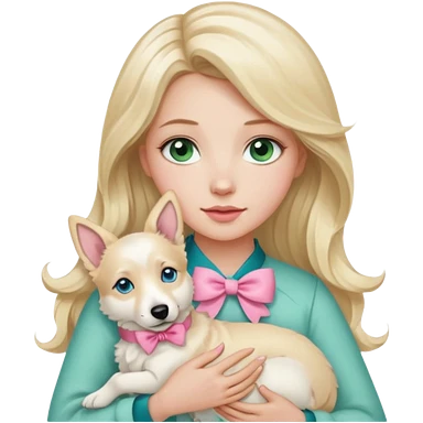 A girl in blue shirt with blonde hair holds a blonde cat in green eyes emoji