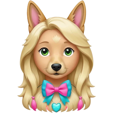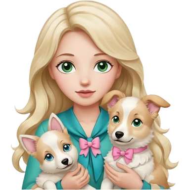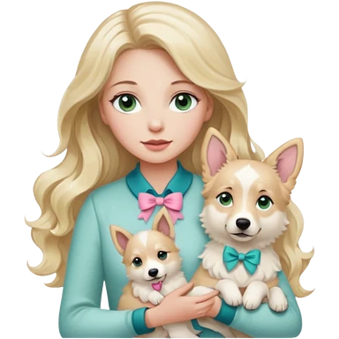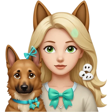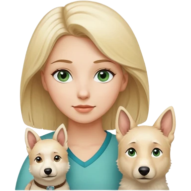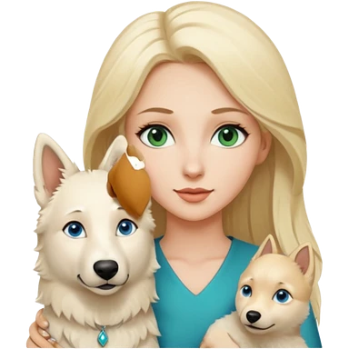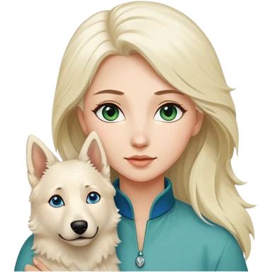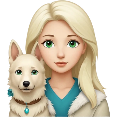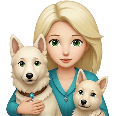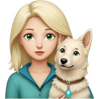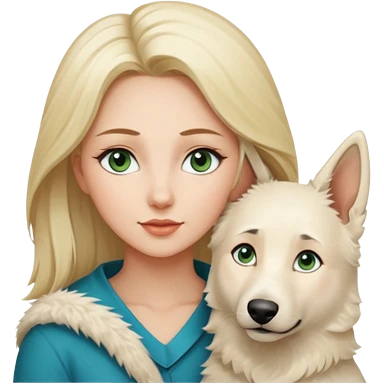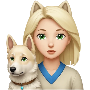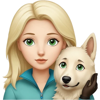 A white blonde Hair Woman with blue Green eyes with a White Shepard with a little bit beige in the fur in a lovely pose emoji | AI Emoji Generator