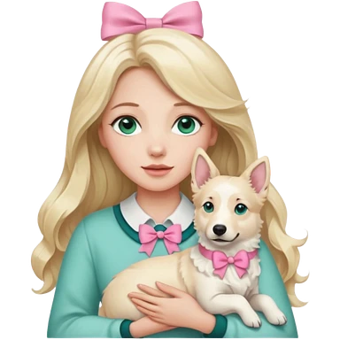 A white Long Wave blonde Hair Woman with blue-green eyes, with a Brown eyed White Shepard in the arm ,the dog has a little bit beige in then end of the ears and a pink bow in neck . emoji