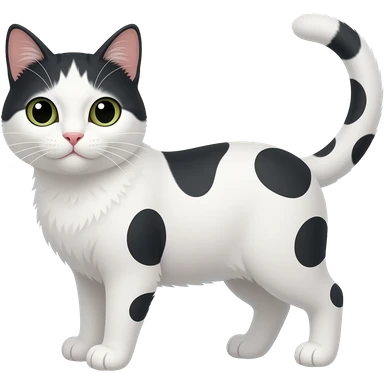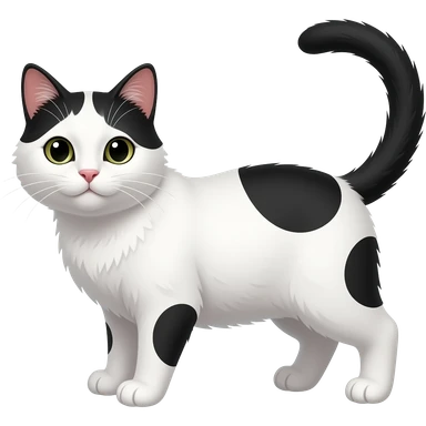 a white cat with brown tabby patches on the top of his head (ears) a patch on its side/arm and a striped tail the rest of the body is bright white emoji