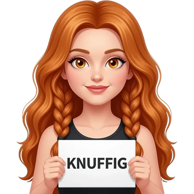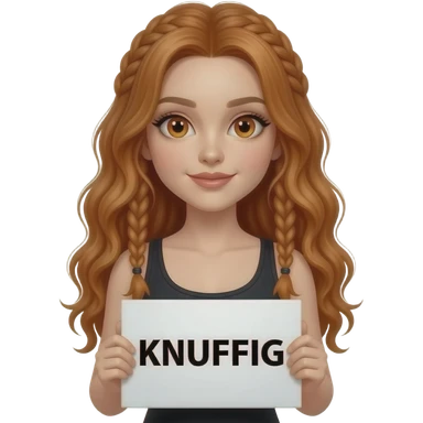 sexy girl with long wavy ginger braids and ginger eyes wearing a black tanktop is holding a white sign with KNUFFIG written on it emoji