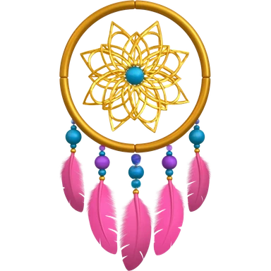 A gold-framed Dreamcatcher. with yellow metal flowers, blue beads, indigo beads, purple beads. And with pink feathers hanging down emoji