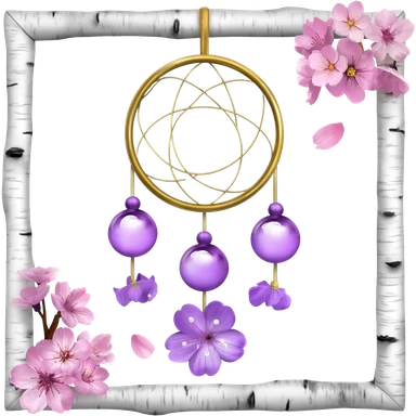 A white-birch-framed Dreamcatcher. with purple-round-orbs, gold-rings hanging down. purple flowers, pink sakura flowers, emoji