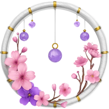 A white-wooden-circle-framed Dreamcatcher. with purple-round-orbs, gold-rings hanging down. purple flowers, pink sakura flowers, emoji