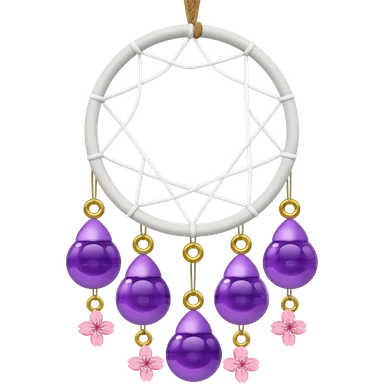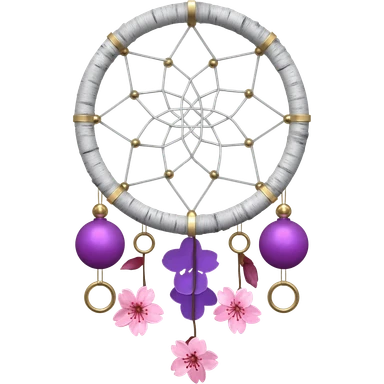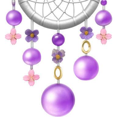 A silvery-white Dreamcatcher. with purple-round-orbs, gold-rings hanging down. purple flowers, pink sakura flowers, emoji