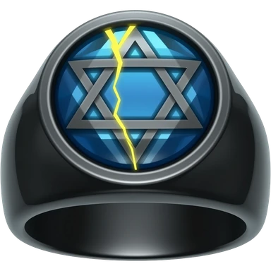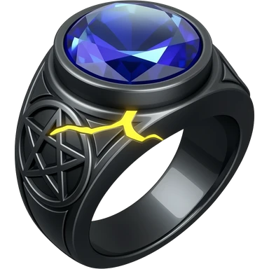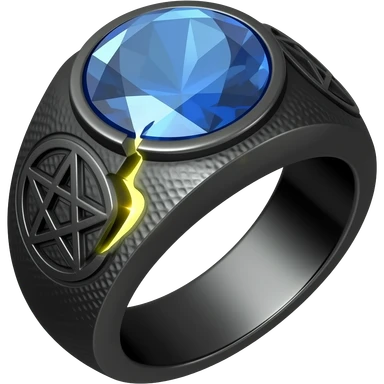 A obsidian ring with a BIG blue gem, that has a pentacle carved into it, and a crack goin through it glowing yellow emoji