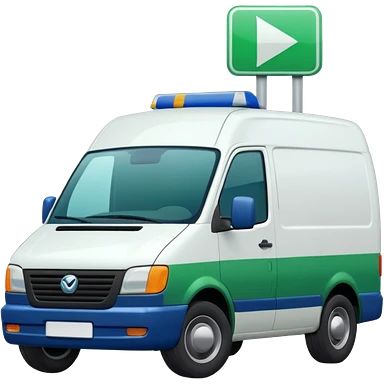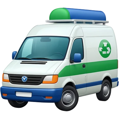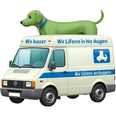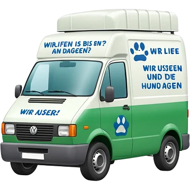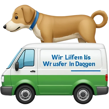 a white delivery van with green and blue color on the delivery van tarpaulin. Text: Wir liefern bis an die Türe. Ausser Ihr Hund ist dagegen" emoji | AI Emoji Generator
