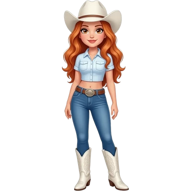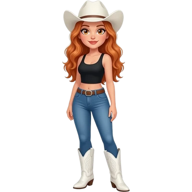 sexy girl with long wavy ginger hair and ginger eyes says wearing blue jeans with white cowboy boots, a white black top and a white cowboy hut emoji