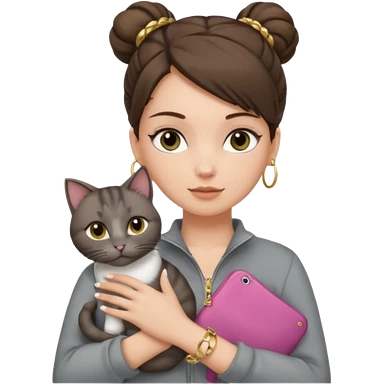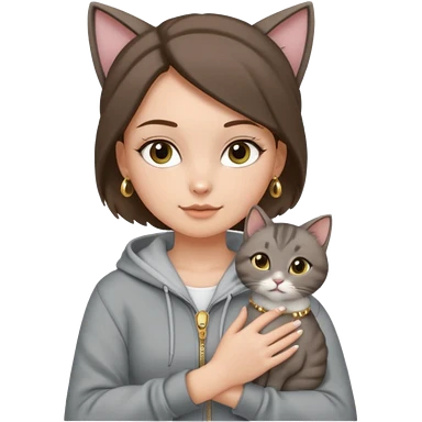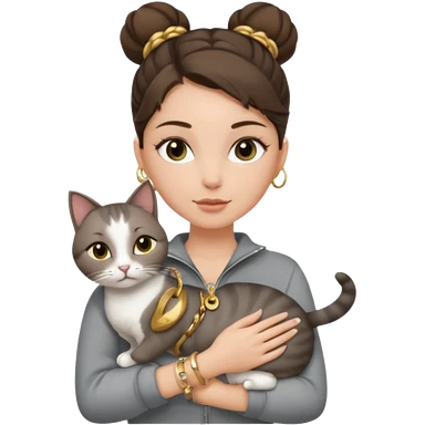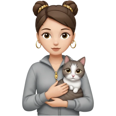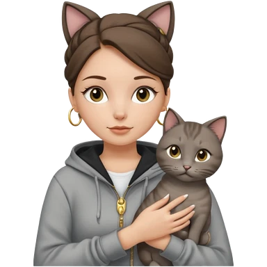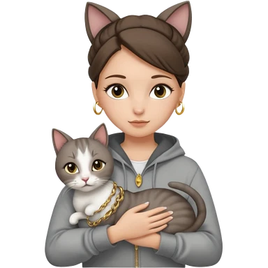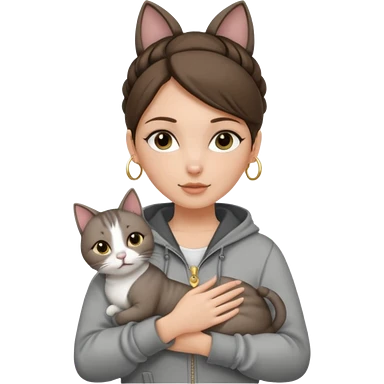 a white girl with brunette hair in a messy bun holding a grey cat. the girl has long lashes and has on a grey zip up that is half way zipped and under a white shirt and gold jewelry that is hoop earrings and gold bracelets. emoji | AI Emoji Generator