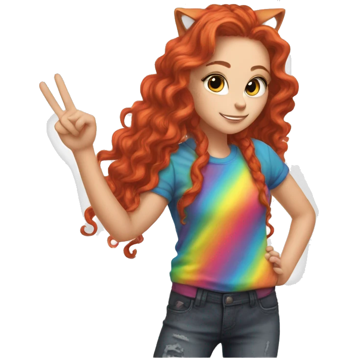 a white girl with long red curly hair in a pony tail with rainbow shirt does peace sign wearing cat ears one black other white emoji | AI Emoji Generator