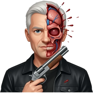 A white guy with a black jacket, his head completely gone, being very bloody and showing his insides, with a shotgun pointing up under his chin emoji | AI Emoji Generator