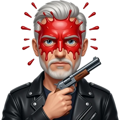 A white guy with a black jacket, his head is completely gone and replaced with a red liquid explosion completely covering his face, head, hair, mouth, eyes, nose, ears, and skin, with a shotgun pointed up under his chin emoji