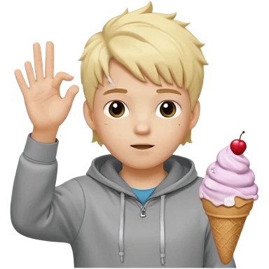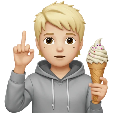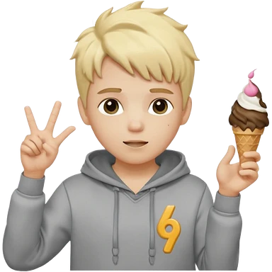 a white kid blone hair with a grey hoodie and his above his hands saying 67 one 6 on 1 hand 7 on the other emoji | AI Emoji Generator